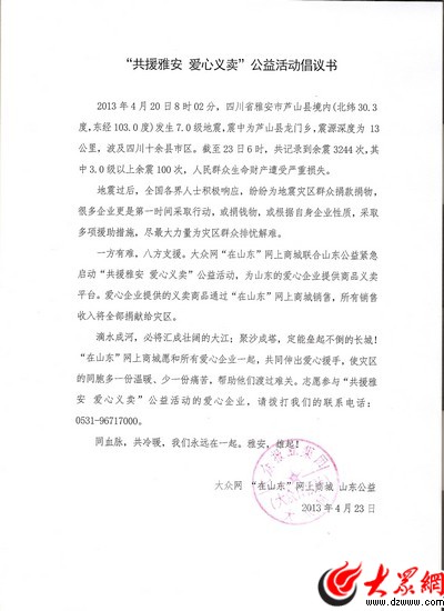 大眾網“在山東”網上商城聯合山東公益,第一時間緊急啟動“共援雅安,愛心義賣”公益活動,為山東的愛心企業提供商品義賣平臺。愛心企業提供的義賣商品通過“在山東”網上商城銷售,所有銷售收入將全部捐獻給災區。