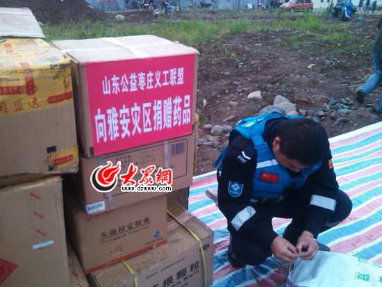 大眾網濟南4月23日訊(記者 王磊)“我們已抵達蘆山縣,今天與藍天救援隊一起裝卸救援物資。”今天下午,在蘆山縣第三小學附近的救援物資轉運站,山東公益救援分隊汲春鋒等3人已冒雨奮戰了8個小時,凌晨隨救援車隊進入震區后,他們僅休息了不到3個小時,就立即加入到了裝卸救援物資的隊伍。