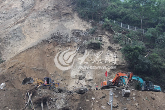 寶興縣城連通五個鄉(xiāng)鎮(zhèn)的兩河口路被塌方泥土和巨石阻斷,救援人員正在緊急作業(yè),排除障礙。特派記者 尹海洋 攝