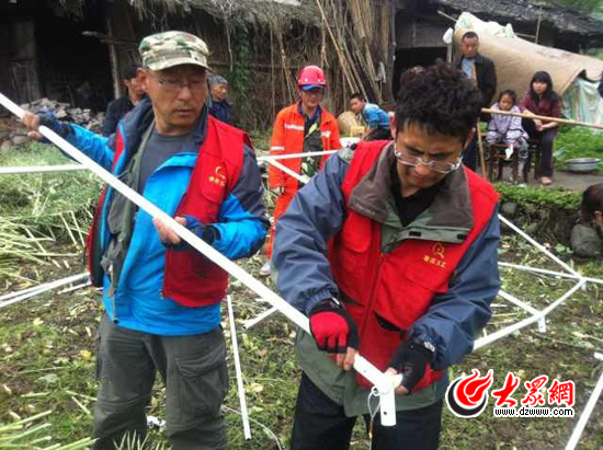 大眾網(wǎng)濟(jì)南4月24日訊(記者 王磊)“這里的村民說急需帳篷和大米,”在雅安地震震中附近的蘆山縣龍山鄉(xiāng)河心村,山東公益救援分隊(duì)的汲春鋒3人與2名四川青年志愿者協(xié)會(huì)的隊(duì)員一起,今天白天已幫助這里的老人們搭建起8個(gè)臨時(shí)安置帳篷和1個(gè)工作棚。汲春鋒說,今晚返回蘆山縣城的大本營后,將協(xié)調(diào)解決這里的物資短缺情況。