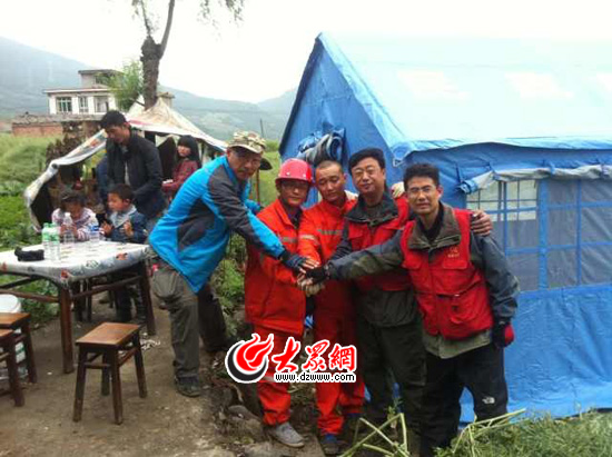 來到雅安地震的震中蘆山縣的第二天,今天上午,山東公益棗莊義工聯(lián)盟汲春鋒、宋將和魏先東3人經(jīng)過與四川青年志愿者協(xié)會(huì)聯(lián)系,與2名志愿者組成臨時(shí)救援分隊(duì),搭乘救援車輛來到了被大山包圍中的蘆山縣龍山鄉(xiāng)河心村,他們領(lǐng)到的任務(wù)是幫助這里的村民在安置區(qū)搭建帳篷。