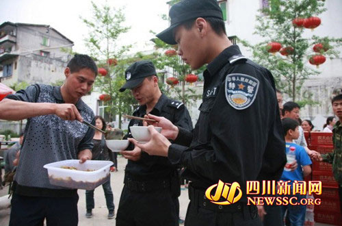 特警們匆匆吃著百姓送來的飯菜