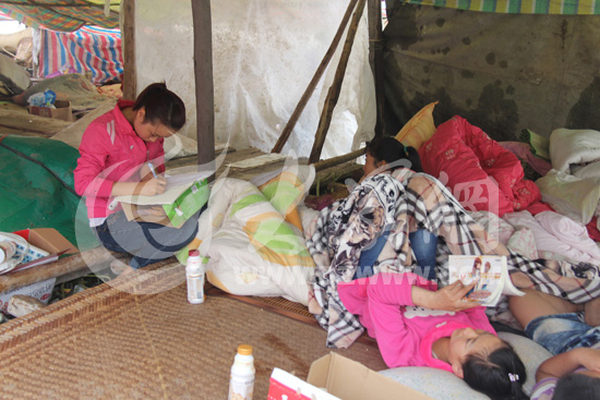 沿著龍門鄉(xiāng)主干道進入青龍村,記者從一處村民自己搭建的帳篷里聽到了清脆的背書聲,并不熟練的英語發(fā)音讓頹廢的村落頓時有了生氣。尋著聲音走進一片田野當中的帳篷群,記者找到了這個聲音的來源:一個十幾歲的女孩正坐在簡陋的帳篷里、端著一本英語課本專心背誦。