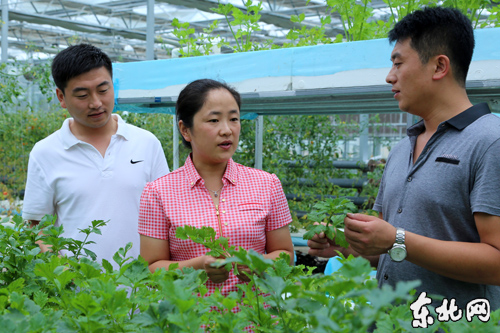 王淑媛與工作人員攀談無土栽培芹菜技術。東北網記者 侯巍 攝