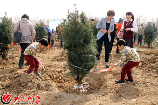 雙胞胎兄弟在媽媽的幫助下栽種小樹苗