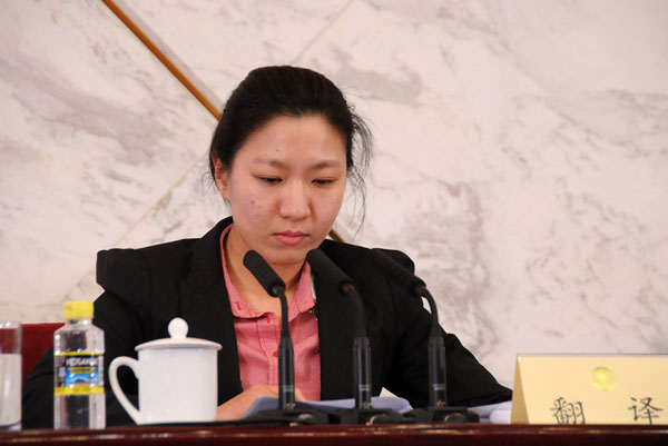 3月2日,全國政協(xié)十二屆一次會議新聞發(fā)布會在人民大會堂一樓新聞發(fā)布廳召開。圖為發(fā)布會翻譯。新華網(wǎng)/中國政府網(wǎng) 翟子赫 攝