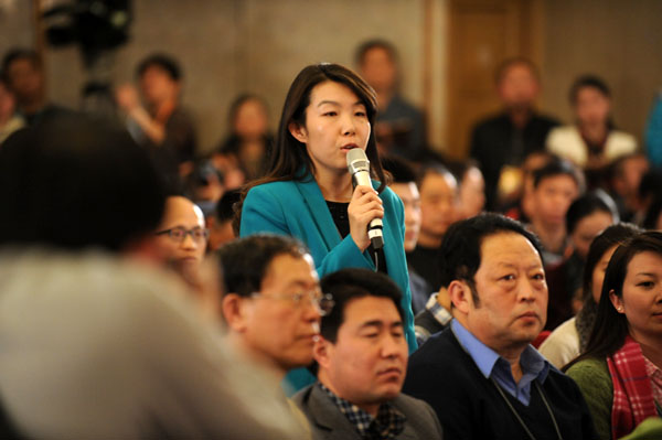 3月2日,全國政協十二屆一次會議新聞發布會在人民大會堂一樓新聞發布廳召開。圖為新華社記者提問。新華網/中國政府網 陳競超 攝
