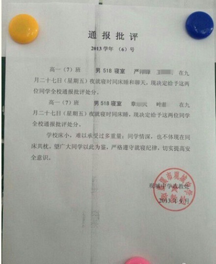 浙江慈溪市觀城中學(xué)高一7班兩對高中男生,一對因同床聊天和睡覺,另一對也因同床睡覺,受到全校通報批評處分。這在網(wǎng)上引起網(wǎng)友的熱烈討論。根據(jù)校方的解釋,學(xué)校宿舍床太小,難以承受過多重量,考慮到安全問題,即便同學(xué)情深,也不體現(xiàn)在同床共枕。望廣大同學(xué)以此為鑒,嚴(yán)格遵守就寢紀(jì)律,切實提高安全意識。