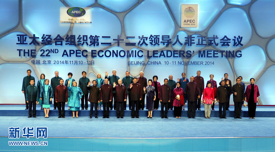 11月10日,國家主席習近平和夫人彭麗媛在北京為出席亞太經合組織第二十二次領導人非正式會議的各經濟體領導人及配偶舉行歡迎晚宴。這是晚宴前,習近平和夫人彭麗媛與各經濟體領導人及配偶集體合影。 新華社記者鞠鵬攝