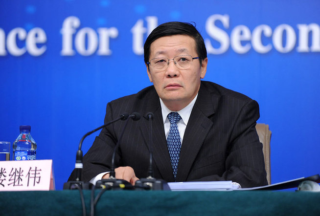 2014年3月6日上午9時,十二屆全國人大二次會議新聞中心在梅地亞中心多功能廳舉行記者會,邀請財政部部長樓繼偉、副部長張少春就“財稅體制改革和財政工作”的相關問題回答中外記者的提問。圖為財政部部長樓繼偉。新華網/中國政府網 翟子赫攝