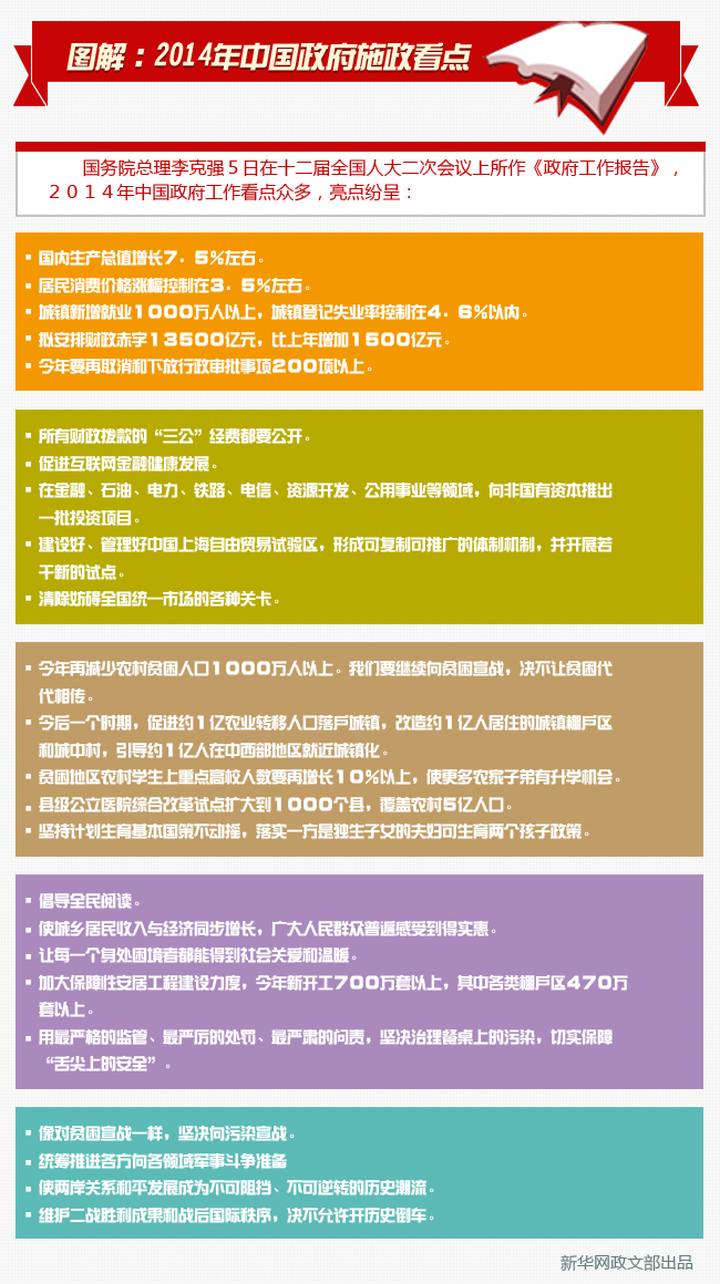 根據國務院總理李克強5日在十二屆全國人大二次會議上所作《政府工作報告》,2014年中國政府工作看點眾多,亮點紛呈。
