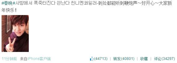 李敏鎬發微博,10分鐘轉發4萬,點贊4萬,評論3萬4。李敏鎬曬圖鳳凰網娛樂訊 1月30日春晚直播,李敏鎬將與庾澄慶演唱《情非得已》。在等候上臺時,李敏鎬發了條微博“到處都能聽到鞭炮聲”