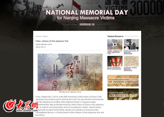 2014年12月13日,是中國首個“南京大屠殺死難者國家公祭日”。在此紀念日來臨之際,大眾網(wǎng)獨家視頻策劃--“難以忘卻的記憶--全球?qū)ぴL見證人·口述中國抗戰(zhàn)史”在China Daily官網(wǎng)“南京大屠殺死難者國家公祭日”專題以及華盛頓郵報全文刊發(fā)。