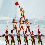 臨沂大學舞蹈學院大一新生陸遠(左二)在臨沂大學體育場,與國旗合影,...