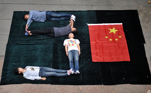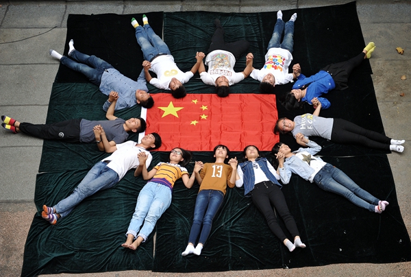 9月25日,山東聊城大學美術學院大學生舉辦我和國旗合個影活動,圖為“跟著國旗方向走”。