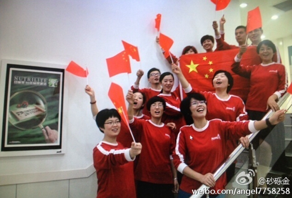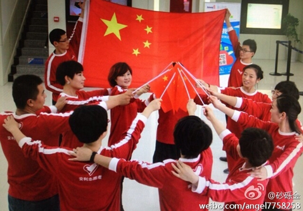9月23日,兩區一圈看濱州——首屆中國網絡媒體濱州行采訪團在鄒平縣采訪期間,參與采訪的全國各知名網站記者及大眾網濱州站工作人員在櫻花山和國旗合影,為中國點贊。