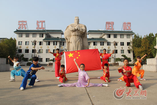 9月29日,菏澤市鄆城縣宋江武校學(xué)子與國旗合影。