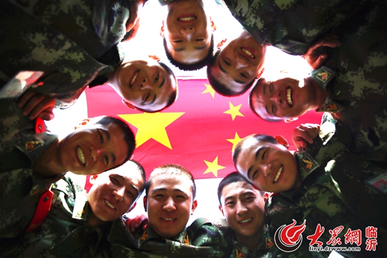 10月1日,武警臨沂支隊剛?cè)胛樾卤c國旗合影,為中國點贊