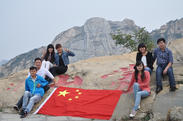 沂蒙山旅游去龜蒙景區工作人員在蒙山山門前和國旗合影,為中國點贊。