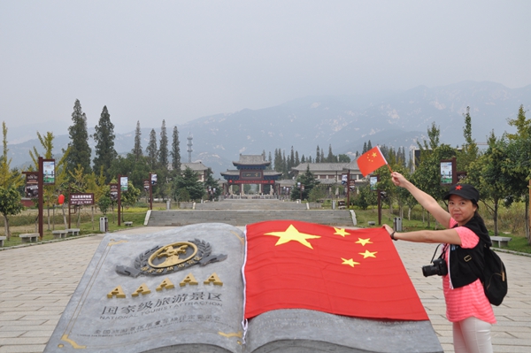 拍客在沂蒙山旅游區蒙山龜蒙景區5A景區標志前和國旗合影,為中國點贊。