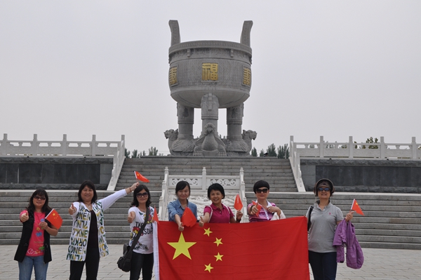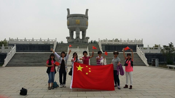 游客在沂蒙山旅游區龜蒙景區福壽康寧鼎前和國旗合影,為中國點贊。