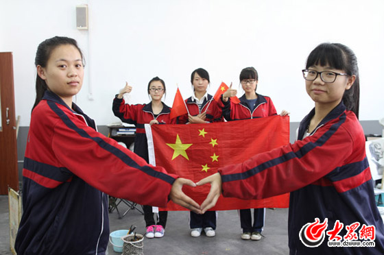 臨沂七中美術特長生在畫室與國旗合影為中國點贊