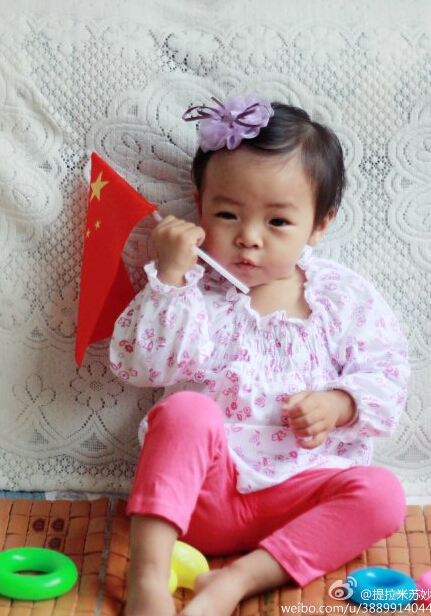 可愛的小寶寶手拿國旗合影,為祖國點贊:“祖國,我愛你”