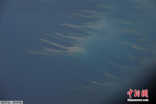 3月9日,從越南空軍飛機上拍攝的搜救區域的油污帶。據越南媒體報道,越南交通運輸部副部長范貴焦3月9日表示,疑似油污的黃色水痕已經開始沿著風向擴散,與昨天相比向西南方向傾斜飄移80公里。