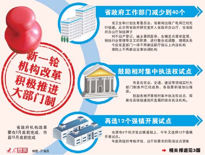 改革開放以來,我省先后實施了五次機構改革。根據3月19日公布的《山東省機構編制委員會關于山東省人民政府職能轉變和機構改革的實施意見》,這一輪改革,要積極推進大部門制,理順權責關系,規范機構設置。省政府機構改革要在3月底前完成,市縣10月底前完成。