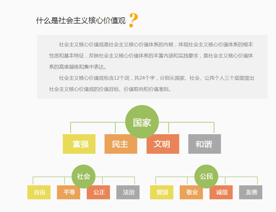 社會(huì)主義核心價(jià)值觀是社會(huì)主義核心價(jià)值體系的內(nèi)核,體現(xiàn)社會(huì)主義核心價(jià)值體系的根本性質(zhì)和基本特征,反映社會(huì)主義核心價(jià)值體系的豐富內(nèi)涵和實(shí)踐要求,是社會(huì)主義核心價(jià)值體系的高度凝練和集中表達(dá)。