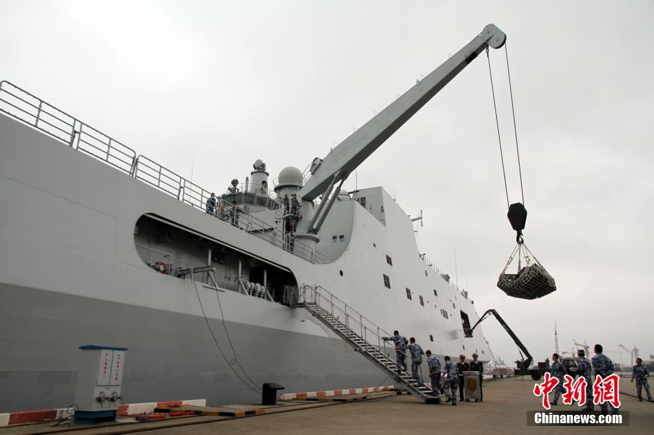3月9日,井岡山艦吊運(yùn)裝載救援物資。經(jīng)中央軍委批準(zhǔn),海軍派出2艘艦艇參加馬來(lái)西亞航空公司失聯(lián)航班救援行動(dòng)。3月8日晚11時(shí)50分,正在南沙海域執(zhí)行任務(wù)的導(dǎo)彈護(hù)衛(wèi)艦綿陽(yáng)艦奉命起航趕赴出事海域。3月9日凌晨3時(shí),海軍兩棲登陸艦井岡山艦搭載由14名醫(yī)護(hù)人員組成的醫(yī)療分隊(duì)、10名潛水員組成的水下搜救分隊(duì)、52名陸戰(zhàn)隊(duì)員攜帶沖鋒舟、橡皮艇等救生器材組成的救援兵力和2架艦載直升機(jī),從湛江軍港緊急起航趕赴出事海域參與救援。中新社發(fā) 甘俊 攝