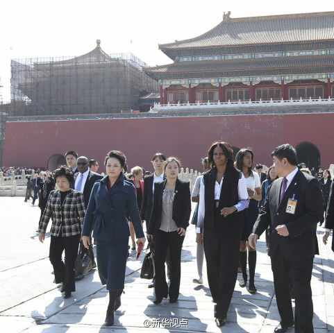 【彭麗媛和米歇爾一起參觀故宮】21日,彭麗媛和米歇爾一起參觀故宮。故宮博物院院長單霽翔介紹說,故宮在北京的中軸線上。在美國華盛頓,國會山到林肯紀念堂也在一條中軸線上,這說明中美在建筑和城市規(guī)劃上也有相通之處。