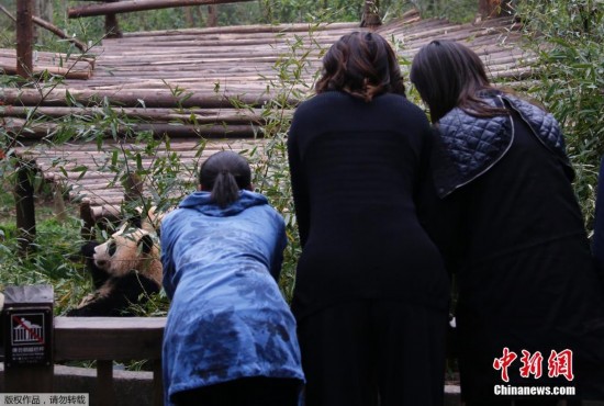 美國(guó)總統(tǒng)奧巴馬夫人米歇爾·奧巴馬26日參觀成都大熊貓繁育研究基地,并與大熊貓合影留念。2014年3月26日,成都,正在對(duì)中國(guó)進(jìn)行訪(fǎng)問(wèn)的美國(guó)總統(tǒng)夫人米歇爾一行參觀成都大熊貓基地,與“國(guó)寶”進(jìn)行親密互動(dòng)。