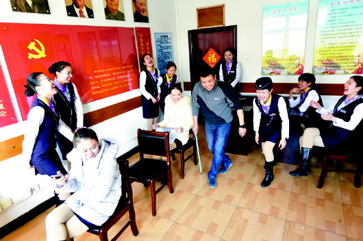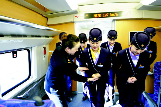 中國最早的動車乘務員之一、曾受過專業培訓的冀莉副隊長在車上為姑娘們作示范。