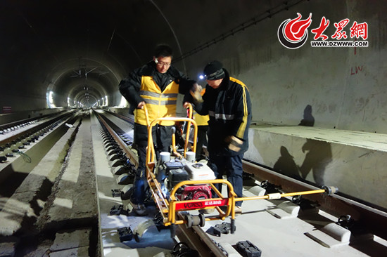 12月份,李魏林的工作地點在蓁山隧道,同樣是進行測距、精調(diào),進入隧道,濃度很高的水泥粉末撲面而來。李魏林說,因為隧道壁還未打磨好,墻壁上的水泥粉末彌漫到隧道里,“一天工作結(jié)束后,頭發(fā)都變白了。”一進入工作區(qū)域,李魏林便笑容收斂,推起軌檢儀開始了嚴謹?shù)墓ぷ鳎斑@里需要減0.5毫米,這個加0.8毫米”,隨后,李魏林熟練地擰下螺釘,更換扣件、墊板,使得誤差精確在1毫米之內(nèi)。