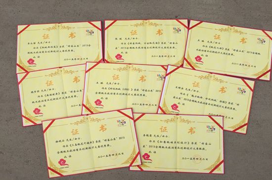 李艷霞老師的作品《如意桃娃系列設計》榮獲銀獎,王琳老師的作品《標志—好運肥城》、《桃花之語》榮獲優秀獎,學生王明法的《魅力桃都》、徐曉云的《三喜桃花千遍紅》、張隧的《萬畝桃花海》、李永麗的《肥城—西游篇》、魏夢穎的《麻姑仙桃》等作品分別榮獲優秀獎。