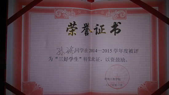2014年度,他因為各項成績突出被評為學校的三好學生,他還參加施工員考試并取得合格證書。2015年度,他被推薦加入學院專利小組,為學院實用型專利項目開展科研工作。從他身上我們看到了一個學生干部,熱愛學習,關心同學,關愛孤寡老人的優秀思想品德。他成為學生干部和學生學習的好榜樣。