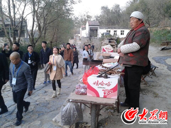 27日,“聚焦‘一圈一帶’——第十屆中國網絡媒體山東行”采訪團走進有著600多年歷史、被稱為“齊魯第一古村”的章丘市朱家峪。朱家裕村民在景區內出售土特產品。