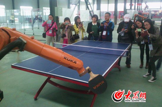 10月29日下午,“聚焦‘一圈一帶’——第十屆中國網絡媒體山東行”采訪團來到山東諾博泰智能科技有限公司,走進奇妙的“機器人世界”。圖為能打乒乓球的機器人引起記者們的圍觀。記者 王宗陽 攝