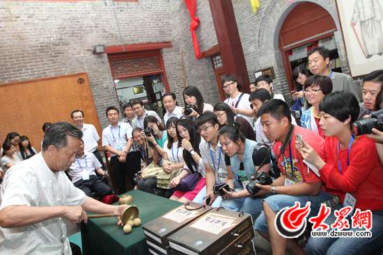 記者們在周村大街的商號內觀看傳統魔術表演。