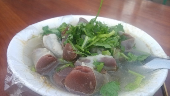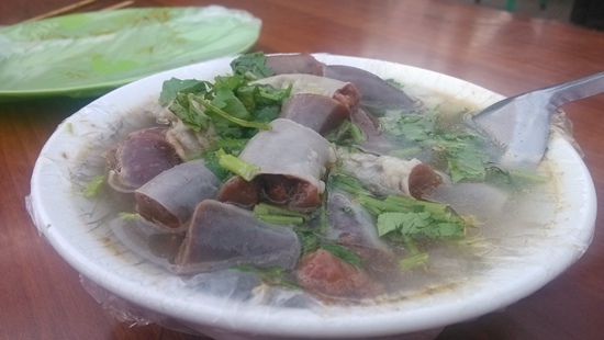 羊腸子也叫清血腸,實際上是由鮮羊腸皮灌入羊血、淀粉、香料,然后在加了多種佐料的老湯里煮熟,再配上湯料盛到碗里食用。羊腸子有肥有瘦,所謂肥瘦就是指腸衣上脂肪的多寡,其中肥腸是老餮們的最愛,去得晚了,經常會點不到,但如果是第一次品嘗羊腸子,還是推薦先吃瘦腸適應一下。
