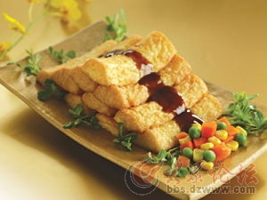 臨清傳統名吃。因賣主總是切好放在一塊特制的長方形木板上出售,故稱“托板豆腐”。在臨清,每天從早到晚都能看到手推車、自行車或是肩挑的小擔上,放著一大塊用白布包著的顫悠悠、水汪汪、熱乎乎的水豆腐,男女老少爭相購買。尤其是早晨,街頭巷尾隨處可見手捧托板豆腐,吃得滿口香甜、津津有味的顧客。水豆腐是用上等黃豆,經脫皮、水泡后、磨成汁,用布濾出豆漿,倒入鍋中燒開,加鹵水精心點制而成。其特點是白嫩、細膩、香甜,營養豐富,便于人體消化吸收,是方便可口的快餐。