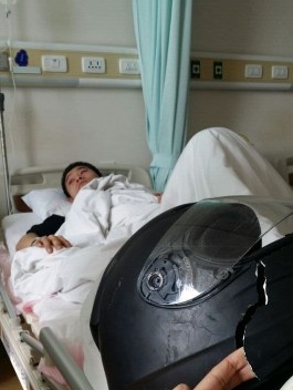 王晶頭戴的頭盔已經(jīng)摔碎,頭盔背面已經(jīng)磨平。