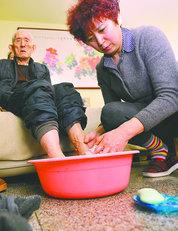 27日晚上7點半,房澤秋打好熱水為老人洗腳。