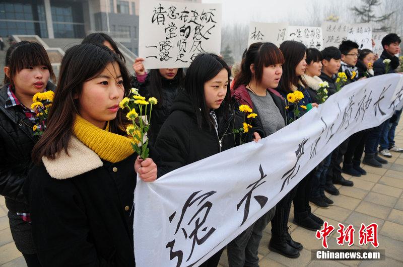 2014年1月7日,在山東聊城大學(xué)逸夫圖書館樓前,美術(shù)學(xué)院的大學(xué)生在舉辦追思邵逸夫活動,為先生送行。張振祥 攝