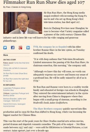 香港電影大亨邵逸夫爵士于當地時間周二去世,各大國外媒體也第一時間發文,悼念這位亞洲傳媒業的大亨、電影業的先驅者、功夫電影的締造者。邵逸夫是香港電影業的代表性人物,將中國功夫電影帶到西方,將香港這個曾經的英國殖民地打造成“東方好萊塢”。