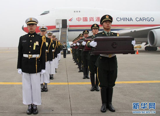 根據中韓雙方達成的共識,經過相關部門共同努力,當地時間3月28日上午7時30分,中韓雙方在韓國仁川國際機場,舉行在韓中國人民志愿軍烈士遺骸交接儀式。中方交接在韓志愿軍烈士遺骸代表團團長、民政部優撫安置局局長鄒銘與韓方代表、韓國防部軍備控制次長文尚均準將現場簽署了交接書,確認交接437具志愿軍烈士遺骸以及相關遺物。隨后,中方為烈士遺骸覆蓋國旗,并舉行了簡短祭奠儀式,烈士遺骸由中方禮兵護送登上運送遺骸專機。專機將于28日上午飛抵沈陽,祖國和人民將以莊嚴的禮儀迎接烈士英靈回家。