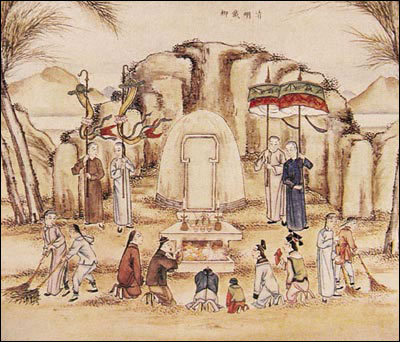 寒食上墓,禮經(jīng)無文,近世相傳,浸以成俗。士庶有不合廟享,何以用展孝思?宜許上墓,用拜埽禮。于塋南門外奠祭,撤饌訖,泣辭。食余于他所,不得作樂。仍編入禮典,永為例程。(《唐會(huì)要》卷二三)