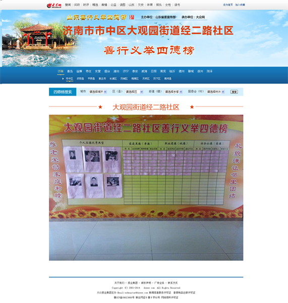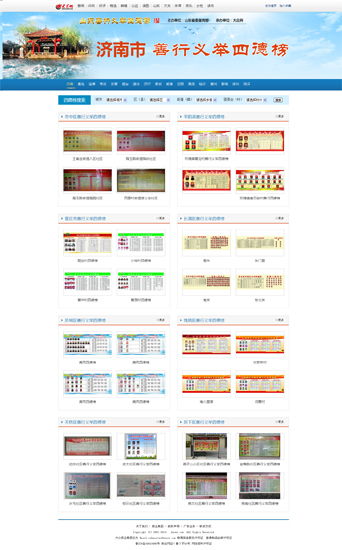 “山東善行義舉四德榜”展示平臺秉承弘揚“四德”的宗旨,通過先進的網絡技術,將山東各地的“四德榜”搬上互聯網,借助網絡強大的傳播力量,讓每一個榜單都能被大家看到,每一位榜上有名的模范都能被褒揚和學習,從而在互聯網上形成“人人做好人,好人做好事,好事就上榜,好人有好報”的良好氛圍。整個平臺涵蓋了17市的137個縣(市、區),各個村(社區)、學校、企業和窗口單位的“四德榜”可以即時在網上呈現。隨著展示平臺內容的不斷完善,網站將開通互動功能,網友可以對各地的“四德榜”和模范進行點評;網站將逐步成為實時展示各地工作成果,考核各地工作情況的多功能綜合性平臺。同時網站也將開設各類專題和舉辦多種活動,開通微博、微信,上傳微電影、微視頻,使社會主義核心價值觀在廣大群眾中以寓教于樂的形式得到最廣泛的弘揚和踐行。