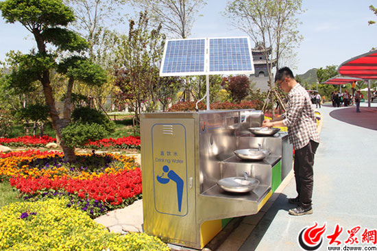 世園會用太陽能加熱的飲用水,一位游客正在接水